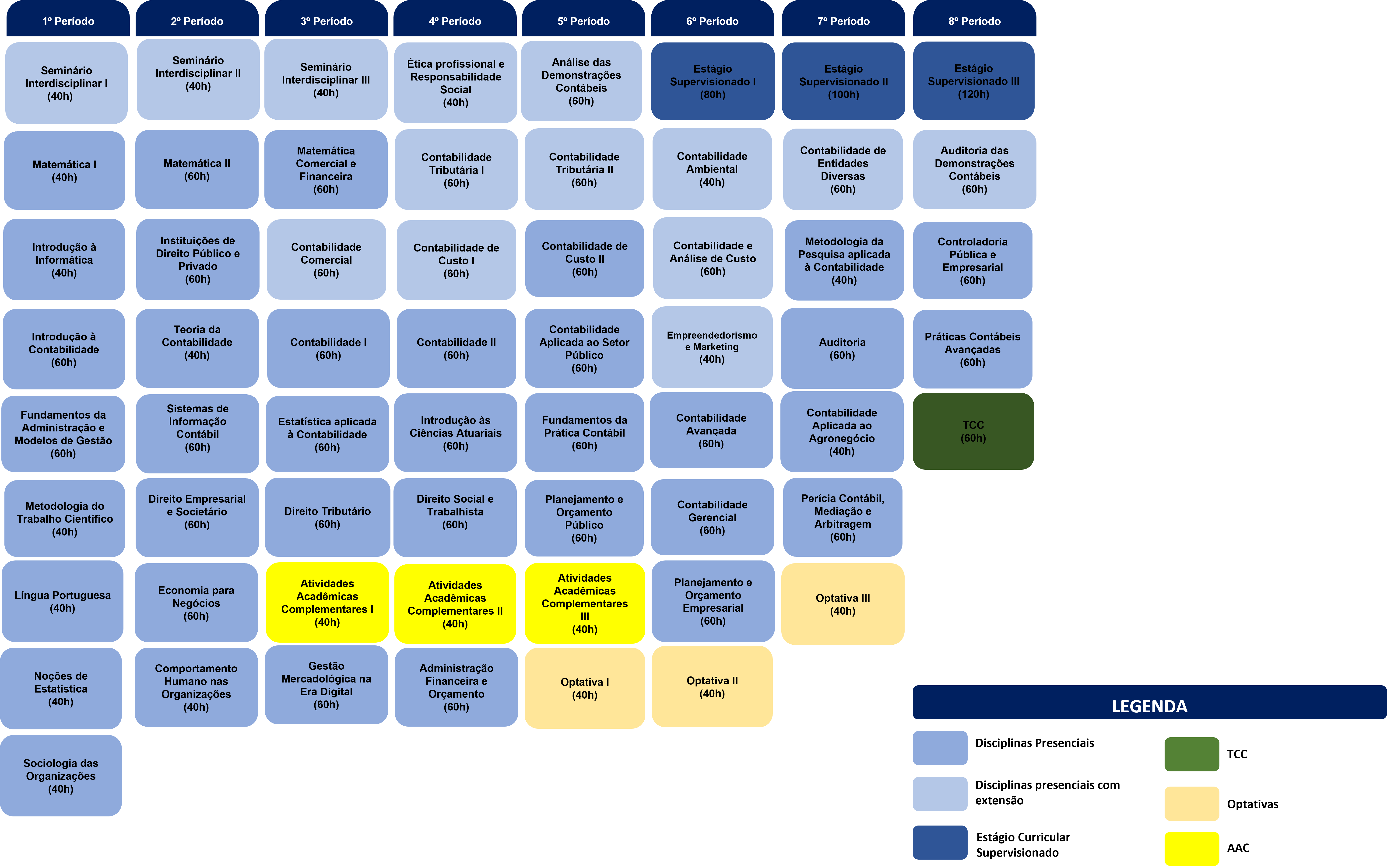 Conteúdos de Formação Teórico-Prática: Estágio Curricular Supervisionado, Atividades  Complementares,  Estudos  Independentes,  Conteúdos  Optativos,  Prática  em Laboratório de Informática,  utilizando softwares atualizados para Contabilidade.